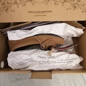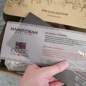 This listing is for a pair of moccasins, made by Manitobah Mukluks. These are the Sunshine style in suede leather with a Vibram sole. The colour name is Oak. They are brand new in the box, never worn. They come complete with tags and a Certificate of Authenticity!