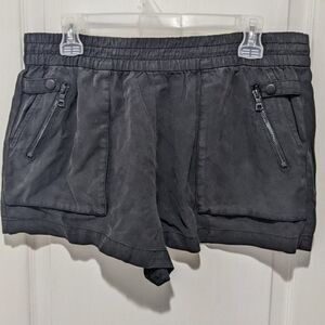 Self: 65% lyocell, 21% linen, 14% cotton.Lining: 100% poly. Made in China. Dry clean only. Smocked elastic waistband. 6-pocket design with zipper and snap button tab details. Lightly faded fabric.