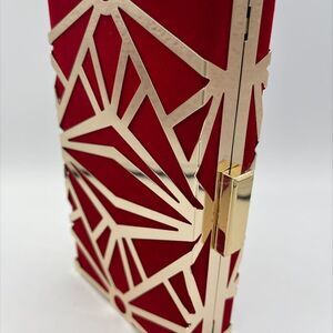Striking clutch, clam shell style with chain strap for shoulder or cross body wear. New item, no tags. Not your Gramma's droopy evening bag but trending geometric lines in sumptuous crimson velvet with gold mirror finish metal overlay. Get ready for prom, wedding, date or club night! Business function in your plans? Perfect with smart suit or dress for an uptick to your look. Style it your way with some completing pieces from Our Closet (some suggestions shown all listed and priced separately), and make a bundle to save a bundle! There's always something Fresh- for you- at Lemon Squeezy Shop🍋