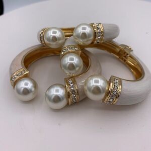 New just in. Chunky sized but elegant hinged cuff for easy wear, with crystals, large faux pearls and mother of pearl, just off white, enamel finish. Wear for evening, wedding, or totally rock the beach scene. Very chic with little white "T". Looks sophisticated stacked in multiples- 3 available, all priced separately. Add a few coordinating pieces from Our Closet (examples shown all listed and priced separately) for a complete fashion forward look. Check in often because there is always something fresh at Lemon Squeezy Shop🍋