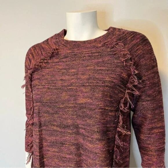 Lord and Taylor cotton blend sweater, a cozy and fashionable addition to your wardrobe. This burgundy mixed thread sweater features charming fringes on the sides, adding a unique and playful touch to its design. Made with a comfortable cotton blend, it is perfect for everyday wear. With its size small and low high length, it offers a flattering fit for various body types. Stay warm and stylish with this must-have sweater from Lord and Taylor. #LordAndTaylorSweater #CottonBlend #FringeDetail #BurgundySweater