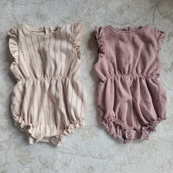 Adorable set of two baby rompers with ruffled sleeves. One features a striped pattern, and the other is solid.