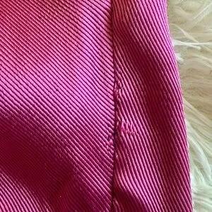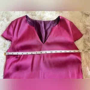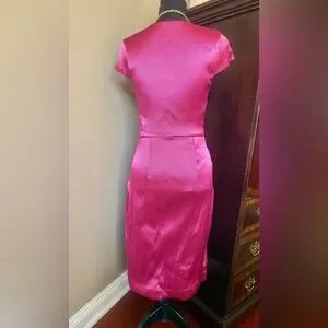 This stunning pink dress features an asymmetrical design with a flattering V-neckline and cap sleeves. Also special are the sheath silhouette, front slit, and material that has a slight sheen to it. A definite stand out dress for any occasion. .