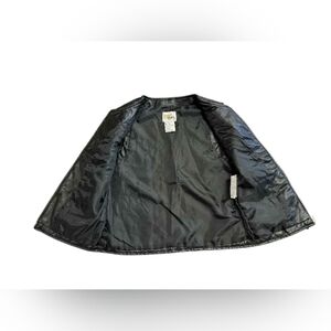 Black pleather vest quilted outter layer round neck lined front zipper closure 2 front zippered pockets sleeveless no extra stretch available