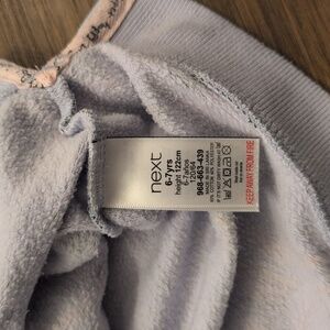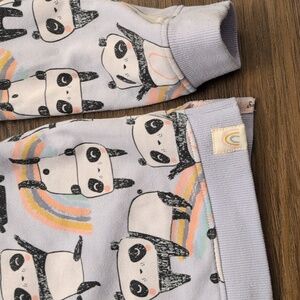 Adorable panda print on purple background. Overall wash wear and some marks on cuffs and hem. I haven't tried to remove, so they may come out.