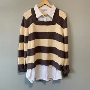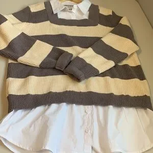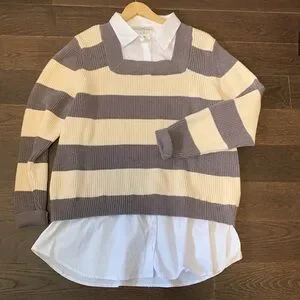 This is a super cute cream and muted purple stripe sweater with an attached white collared shirt underneath.