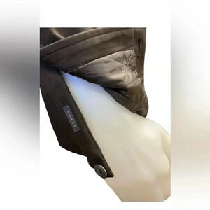 Nexus Apparel Brown Faux Suede Jacket/Coat, front button closure, 2 front pockets, double button cuff closure, two interior pockets one with zipper. No stretch, fitted style, quilted and soft fleece like lining.