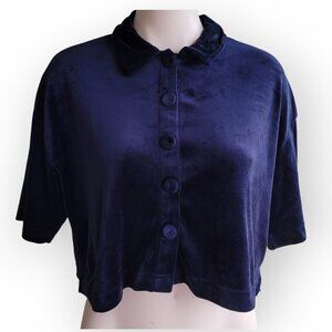 This Nia The Label midnight blue velvet cropped button-up combines elegance and style. Crafted for a timeless fit and suitable for various occasions.