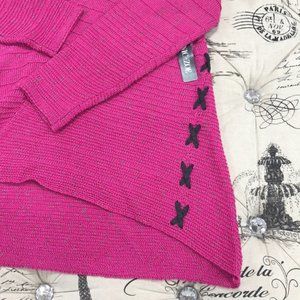 A contrast cross-stitched detail at one side gives a playful twist to this high/low pullover textured with horizontal links stitch.