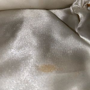 This purse is in good condition. It has some rust in it and a small stain on the silk inside. The chain handle folds into the purse for a clutch style. The clasp works very good.