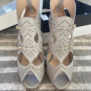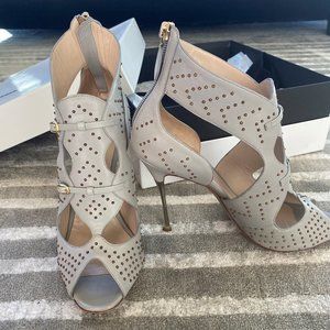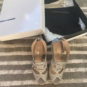 Nicholas Kirkwood Hi Nappa Stud Gladiator heels, grey leather with gold/brass coloured studs.