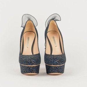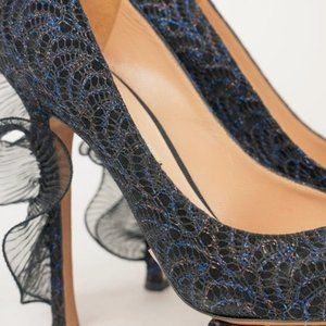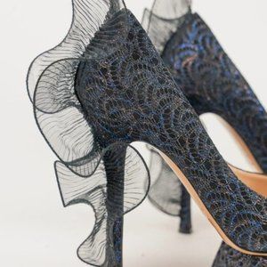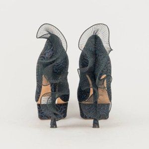 A stunning blend of elegance and electrifying by Nicholas Kirkwood comes in the form of these Snakeskin Ruffle Platforms with a round, closed toe. A unique and eye-catching pair featuring stiletto heels embellished with beautiful sheer ruffles, black suede embroidered with swirling electric blue and copper snakeskin, and a pronounced wedge platform unique to Nicholas Kirkwood that brings a never-before-seen glam to your evening attire.