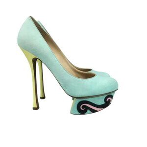 These are high-heeled platform pumps designed by Nicholas Kirkwood, featuring a distinctive wavy pattern on the platform sole. The main body of the shoe appears to be a light, pastel blue color, while the platform features a contrasting wavy pattern in shades of pink and black. The inner lining and heel of the shoe is a light yellow color. The shoes have a rounded toe and a high, slender heel. The most notable feature is the sculpted, wavy platform sole, which gives the shoe a unique and artistic aesthetic.