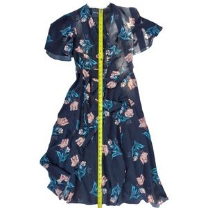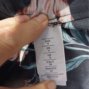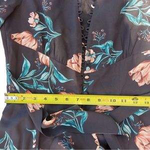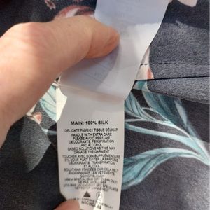 Black floral printed silk crepe (100% Silk). Hourglass. Short sleeves. V-neckline. Exposed front button down placket.