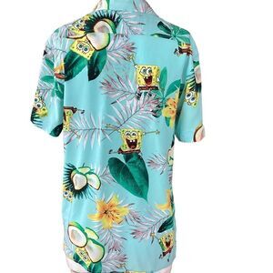 Blue with Sponge Bob print, rayon, New with tags, short sleeves, button front, licensed, neck to hem 30”, armpit to armpit 19”.