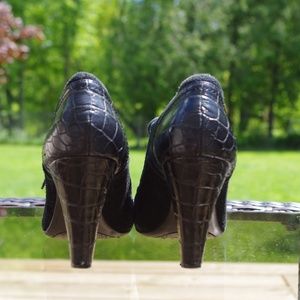 These adorable tie up heels are great for any occasion! The front is a black fabric with black laces and an open toe. The back heel has a mock crocodile texture! Size 7/EU 37.