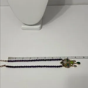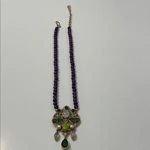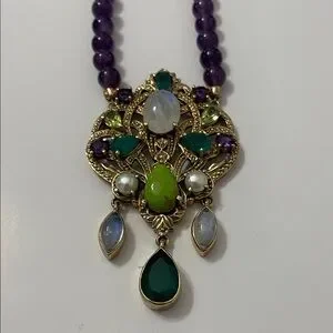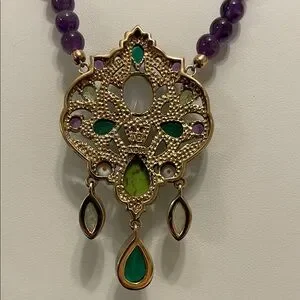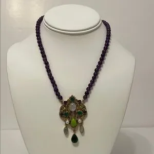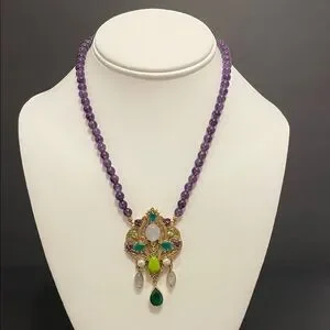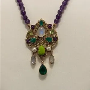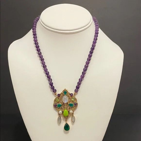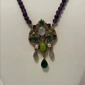 Nicky Butler Raj Collection beaded necklace with ornate pendant. The necklace features an Amethyst bead strand that measures approximately 14” with a 3” extender. The bezel set stones in the pendant include Peridot, Amethyst, Moonstone and Chalcedony. The pendant measures 2 1/2” from the top edge to the bottom of the dangling stone. Nicky Butler is widely recognized for his limited edition collections inspired by Victorian and Art Deco aesthetics and handcrafted in Jaipur, India. This is an Authentic piece stamped on the back of the pendant with NB India.