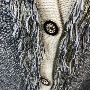 Elegant & classic Chanel -style sweater in gray, black, and subtle gold knit.
