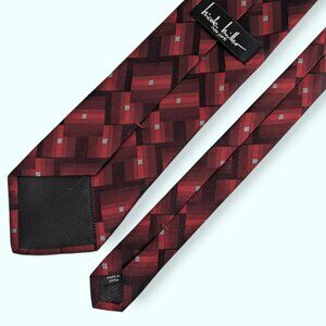 This tie by Nicole Miller has a beautiful red and black pattern, like rotating checks (or check weave). The interior of the tie is black, and there are two tags: one in the skinny end, and one on the back of the thick end (that the thin end can pass through). The fabric is made of 100% silk. There is normal wear but nothing that affects wearability.