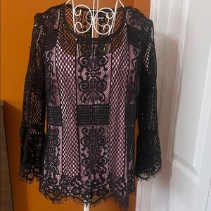 Nicole Miller Black Lace Top with Pink Underlay – Size L (Regular)