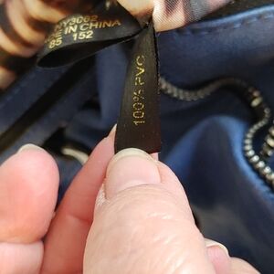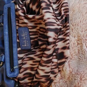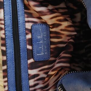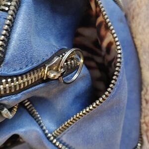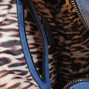 Blue bag with animal print lining and zipper accents. Blue had almost a metallic look to it.