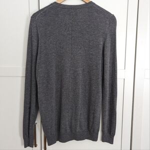 Dark grey Nicole Miller Cardigan with silver metallics throughout the sweater. Tapered wrists and bottom, peek-a-boo holes running down back from neck to bottom with 8 buttons to do up in the front. Lightweight, soft and stretchy. 64% viscose, 35% nylon, 1% metallic yarn. Length across chest 18.5", height from shoulder to bottom 28". Very good condition