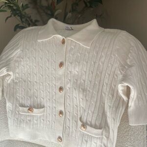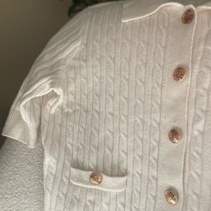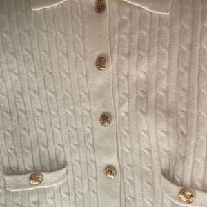 Stylish cream cardigan with elegant cable knit. Features gold-tone buttons for a touch of luxury. Perfect for layering.