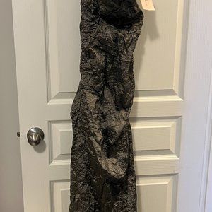 Nicole Miller dark grey strapless full length dress with black trim. Crinkle look with black band at the bottom.