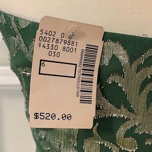 This Nicole Miller Collection strapless gown is a shimmering forest fantasy woven in rich green silk with intricate silver metallic brocade throughout. Originally $520 (or $820 in 2025), and worth every cent for the drama alone.