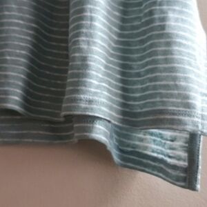 Elevate your casual look with this light blue striped top from Nicole Miller. Featuring scoop neckline, short sleeves, high-low hemline and side slits at hem.