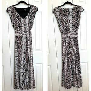 This Nicole Miller New York Python print jumpsuit is a fun and easy piece you didn’t know you needed! Dress up or down and perfect for year round depending on your layering pieces and accessories. Neutral color combination of black, brown, and beige adds to the versatility. Features hidden back zipper, built in wrap belt, cropped wide legs. Fully lined. Drapey jersey fabric of 96%Polyester 4%Spandex. Size 2. Approx flat measurements: Bust16.25” Waist13.5” Hip20” Inseam22.5 Leg Opening13.5”