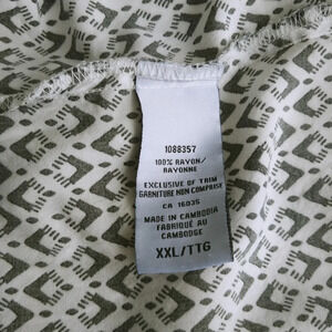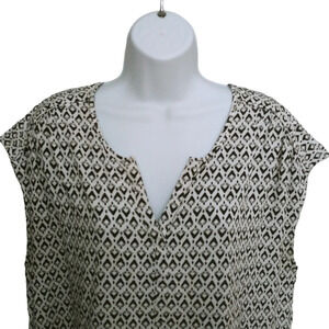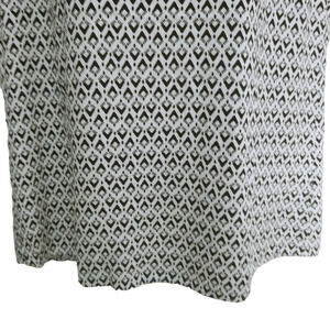 Black and white geometric patterned rayon fabric. Feels like cotton, but smoother. Open Mandarin v-neck collar. Rusching detalmon shoulders. Rounded hem at the back.
