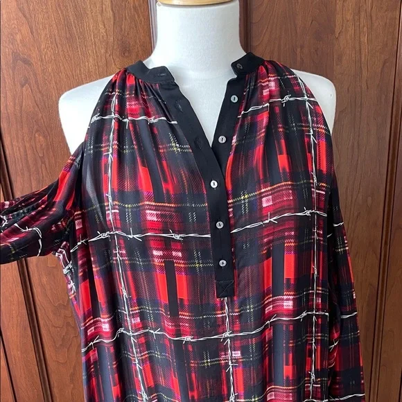 Nicole Miller Red and Black Plaid Cold Shoulder Blouse