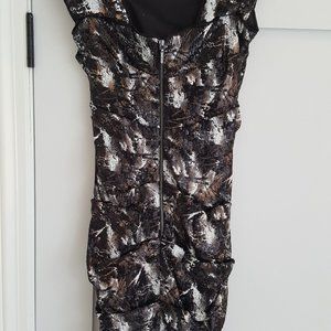 Ready to Party!! Designer Cocktail Dress - black, brown and cream sequin Nicole Miller dress. With ruched waist and asymmetrical neckline. Just above the knee. Excellent condition.