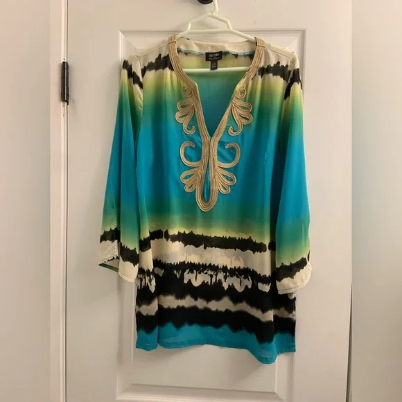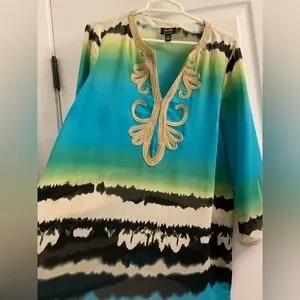 Elegant tunic with a striking color blend. Features intricate neckline embroidery. Ideal for any occasion.