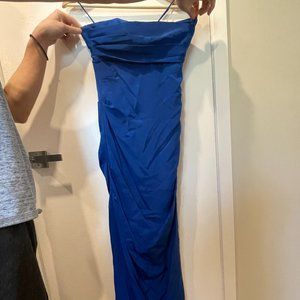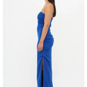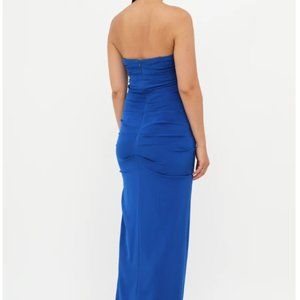 Nicole Miller blue ruched maxi dress featuring a strapless design with sweetheart neckline, slim fit, ruching at bust, sides and back, hidden back zip and a slit at left leg.