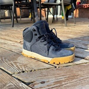 Stylish blue boots with tan soles. Perfect for outdoor adventures.