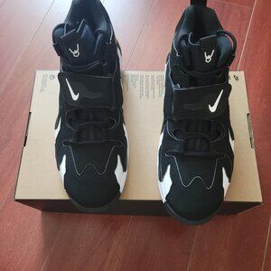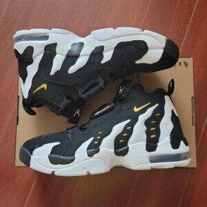 The Nike Air DT Max '96 - Black/White is a retro football sneaker originally worn by Deion Sanders. It features a bold, high-contrast design with a black nubuck upper, aggressive white overlays resembling claw marks, and a midfoot strap for lockdown support. The visible Air Max cushioning in the heel ensures comfort and impact protection, staying true to its '90s performance roots.