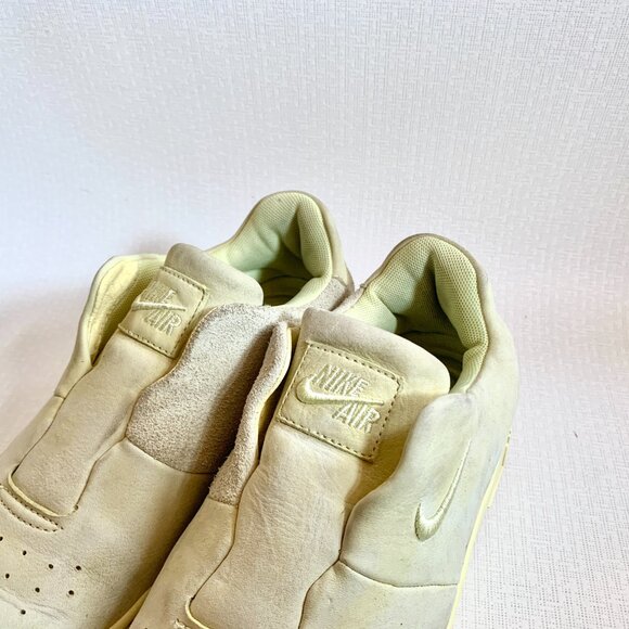 Nike Air Force 1 Slip-On sneakers offer a sleek twist on the iconic AF1 silhouette. Featuring a laceless design, soft suede upper, and subtle pale yellow tone throughout. Some signs of wear and slight discoloration—see photos.