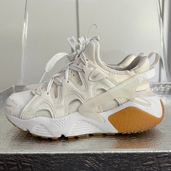 Pre-owned Nike Air Huarache Craft in Summit White. Made in a stretch textile and airy mesh it features cushioned inner sleeves, a caged heel design, plush foam midsole, rubber outsole, lace closure and pull tabs on the heel and tongue.