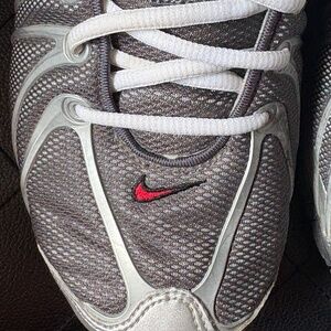 Size: 9.5. Color: Silver, white, and red. Made in Vietnam.
