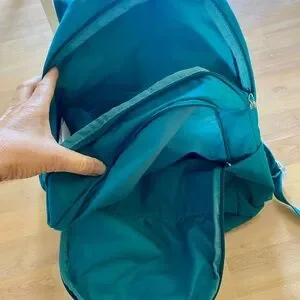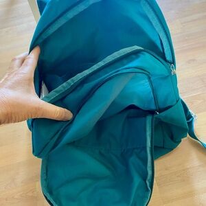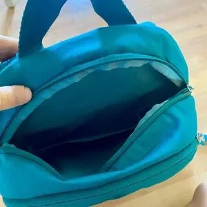Nice Teal coloured backpack from Nike. Adjustable straps. Water bottle holder on both sides, There are two pockets on the front of the backpack and lots of storage inside. Has a separate laptop compartment inside for a 13-14 inch laptop. Used a few times, in great condition , all zippers working. Smoke free home.