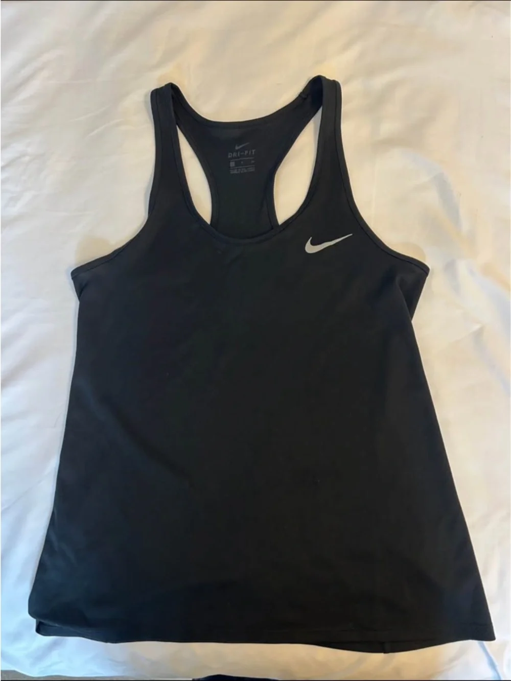 Nike sleeveless racerback tank with Dri-FIT fabric. Lightweight and breathable for workouts. Smooth, stretchy material for active comfort. Subtle Nike swoosh logo on chest.