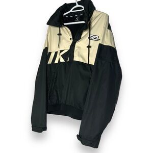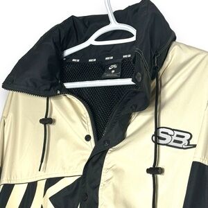 Stylish Nike windbreaker. Features black and cream color scheme. Lightweight and comfortable. Perfect for outdoor activities.