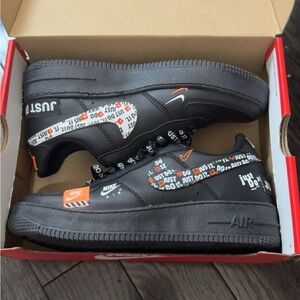 Black Air Force 1 sneakers with orange details. 'Just Do It' laces and logo accents.