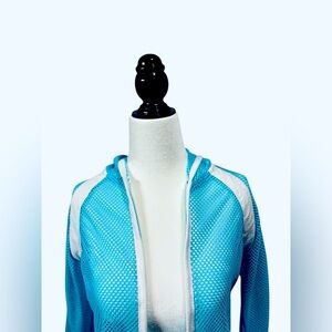 Elevate your sporty wardrobe with this eye-catching turquoise zip-up jacket. The jacket showcases a breathable mesh fabric, perfect for keeping cool during workouts or casual outings. It features a contrasting white zipper and side stripes, adding a retro athletic vibe. The long sleeve design with elastic cuffs ensures a comfortable fit, while its lightweight construction makes it an ideal layering piece for all seasons. Can also be used as a swimsuit cover. Like new π / π