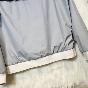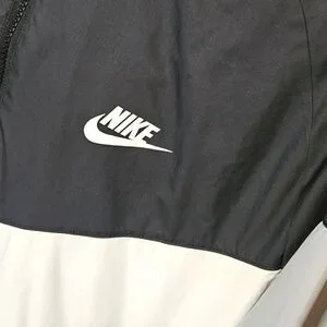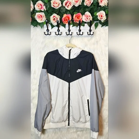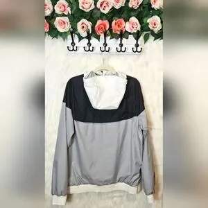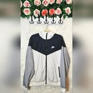 Stay dry and stylish with this used but excellent condition Nike Colorblock Athletic Jacket! Featuring a versatile blue and grey colorblock design, this casual jacket is perfect for everyday wear. The large hood with rain tab is a practical touch, allowing you to pull it down over hats or helmets for added protection. With its comfortable fit and durable construction, this jacket is ready for your next adventure - whether that's a hike, a bike ride, or just running errands. Grab it now and elevate your athletic style!