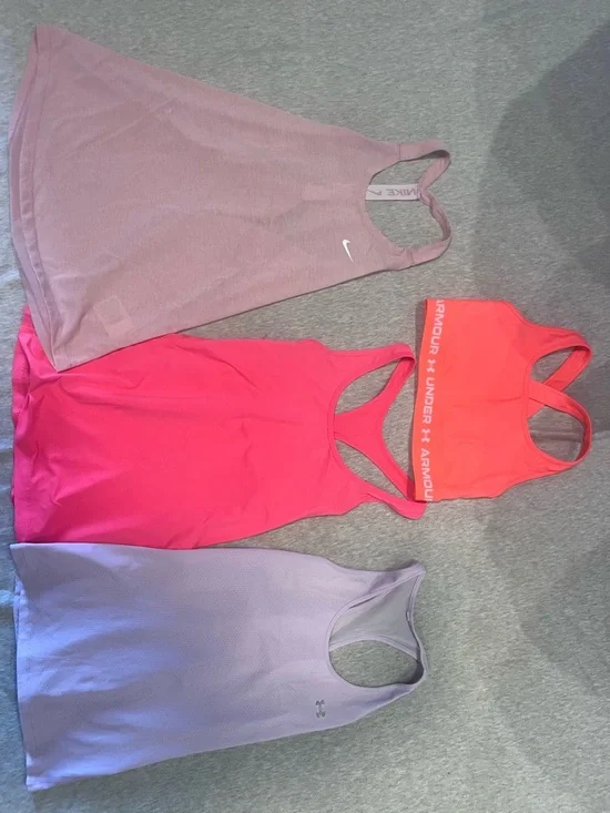 Nike Dri-FIT tank in soft pink. Lightweight, breathable fabric. Ideal for workouts or casual wear. Visible Nike swoosh and printed label.