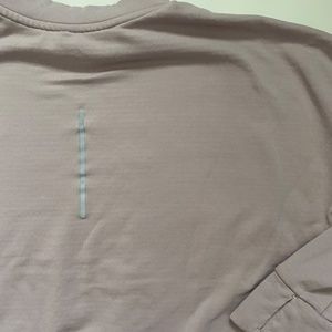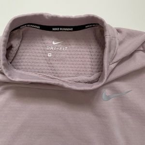 Nike DryFit Running Sweater. Size XS, dusty pink. Reflective logo on front and stripe on back, thumb holes, waffled for warmth. Slight crop, hitting waist length.