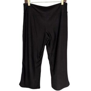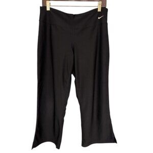 A black Nike capri pants, designed with Dri-FIT technology. This technology helps to wick away sweat, keeping the wearer dry and comfortable during physical activities. The pants are designed for a straight fit with a wide, non-restrictive elastic waist. They are often used for various sports and activities, including running, training, gym workouts, and yoga.
